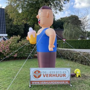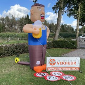 Abraham bierglas van 4 meter hoog! Deze opblaasbare Abraham is erg leuk in de tuin bij de 50-jarige of bij de feest locatie. De feestpop is verpakt in een makkelijk hanteerbare transporttas en is inclusief kleine blower. Deze blower is waterdicht en werkt op normale stroomvoorziening (dus geen krachtstroom nodig). De blower en het opblaasfiguur zijn in iedere auto gemakkelijk te vervoeren. Opzetten dient met 2 personen te gebeuren en is circa 2 minuten werk.