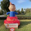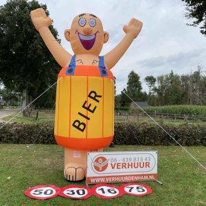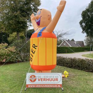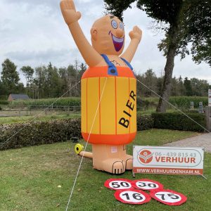 Nieuwe Abraham biervat van 4 meter hoog! Deze opblaasbare Abraham biervat is erg leuk in de tuin bij de 25-jarige of bij de feest locatie. De feestpop is verpakt in een makkelijk hanteerbare transporttas en is inclusief kleine blower. Deze blower is waterdicht en werkt op normale stroomvoorziening (dus geen krachtstroom nodig). De blower en het opblaasfiguur zijn in iedere auto gemakkelijk te vervoeren. Opzetten dient met 2 personen te gebeuren en is circa 2 minuten werk.