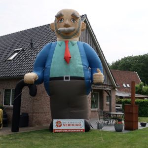 Deze extra grote opblaasbare Abraham mega XXL van 7 meter hoog! Deze opblaasbare Abraham mega XXL is erg leuk in de tuin bij de 50 jarige en/of bij de feest locatie. Het opblaasfiguur is verpakt in een makkelijk hanteerbare transporttas en is inclusief kleine blower. Deze blower is waterdicht en werkt op normale stroomvoorziening (dus geen krachtstroom nodig). De blower en het opblaasfiguur zijn in iedere auto gemakkelijk te vervoeren. Opzetten dient met 2 personen te gebeuren en is circa 2 minuten werk.
