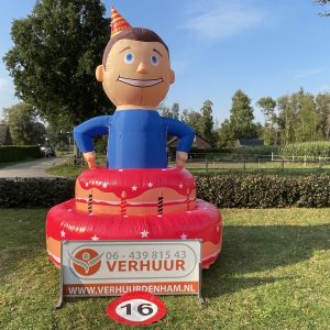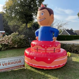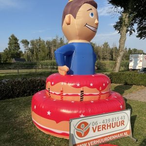 Opblaasbare Abraham junior met taart van 3,5 meter hoog! Deze opblaasbare Opblaasbare Abraham junior met taart is erg leuk in de tuin bij de 16-jarige of bij de feest locatie. De feestpop is verpakt in een makkelijk hanteerbare transporttas en is inclusief kleine blower. Deze blower is waterdicht en werkt op normale stroomvoorziening (dus geen krachtstroom nodig). De blower en het opblaasfiguur zijn in iedere auto gemakkelijk te vervoeren. Opzetten dient met 2 personen te gebeuren en is circa 2 minuten werk.