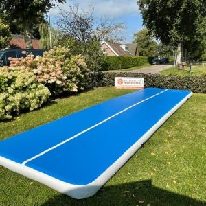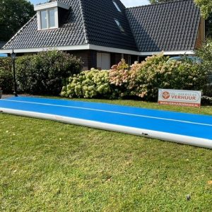 Springmat Tumblingbaan van 8 meter. De opblaasbare mat zorgt voor veel extra sprongkracht, waardoor je de meest extreme capriolen en stunts uit kunt halen. Mocht het echter mis gaan, is de mat er ook weer voor je om je zachtjes op te vangen.