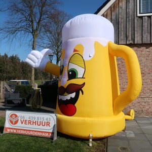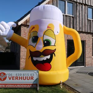 Bierpul Cartoon van 3,5 meter hoog! Deze opblaasbare Bierpul Cartoon is erg leuk in de tuin bij elk feest en tevens inzetbaar voor vele andere leeftijden van een 16-jarige tot bv. 90-jarige , op elke feestlocatie. De feestpop is verpakt in een makkelijk hanteerbare transporttas en is inclusief kleine blower. Deze blower is waterdicht en werkt op normale stroomvoorziening (dus geen krachtstroom nodig). De blower en het opblaasfiguur zijn in iedere auto gemakkelijk te vervoeren. Opzetten dient met 2 personen te gebeuren en is circa 2 minuten werk.