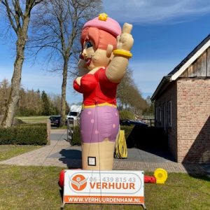 Feestende Sarah van 4,0 meter hoog! Deze opblaasbare Feestende Sarah is erg leuk in de tuin bij de 50-jarige of bij de feest locatie. De feestpop is verpakt in een makkelijk hanteerbare transporttas en is inclusief kleine blower. Deze blower is waterdicht en werkt op normale stroomvoorziening (dus geen krachtstroom nodig). De blower en het opblaasfiguur zijn in iedere auto gemakkelijk te vervoeren. Opzetten dient met 2 personen te gebeuren en is circa 2 minuten werk.