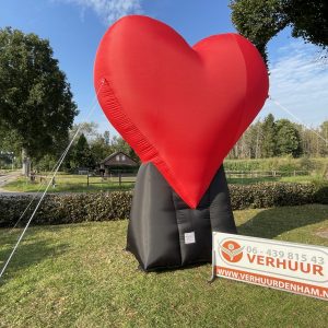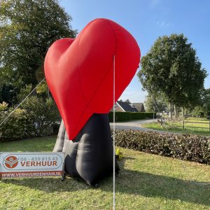 Opblaasbare hart van 4meter hoog! Deze opblaasbare Hart is erg leuk bij elk feest en tevens inzetbaar voor vele andere leeftijden van een 16-jarige tot bv. 90-jarige , op elke feestlocatie. De feestpop is verpakt in een makkelijk hanteerbare transporttas en is inclusief kleine blower. Deze blower is waterdicht en werkt op normale stroomvoorziening (dus geen krachtstroom nodig). De blower en het opblaasfiguur zijn in iedere auto gemakkelijk te vervoeren. Opzetten dient met 2 personen te gebeuren en is circa 2 minuten werk.