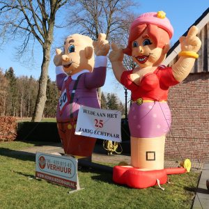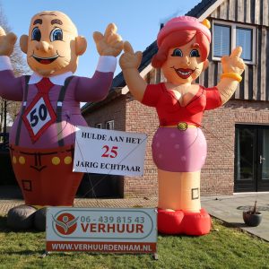 Heeft u een 12,5/25/40 jarig of een ander jubileum? Jubileum set Feestend stel, man en vrouw! P070-P035. Deze opblaasbare figuren zijn erg leuk in de tuin of bij de feest locatie. De feestpoppen is verpakt in een makkelijk hanteerbare transporttas en is inclusief kleine blower. Deze blower is waterdicht en werkt op normale stroomvoorziening (dus geen krachtstroom nodig).