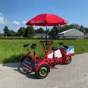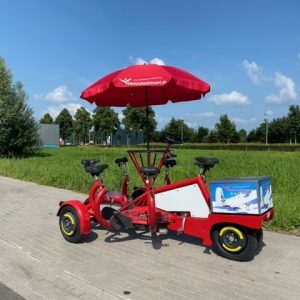 Het Klein Fietscafé, conference bike is een grote driewieler waar zeven mensen in een kring op kunnen zitten. Eén persoon stuurt en de rest kan lekker rondkijken of met elkaar kletsen terwijl ze trappen. Eén ding is zeker u trapt moeiteloos in het rond ook als er iemand niet mee trapt.
