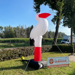 Deze opblaasbare ooievaar van 3.5 meter hoog! Deze opblaasbare Ooievaar met fles is erg leuk in de tuin bij de familie of bij de feestlocatie. Het feestfiguur is verpakt in een makkelijk hanteerbare transporttas en is inclusief kleine blower. Deze blower is waterdicht en werkt op normale stroomvoorziening (dus geen krachtstroom nodig).