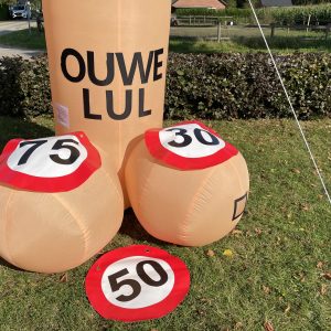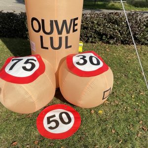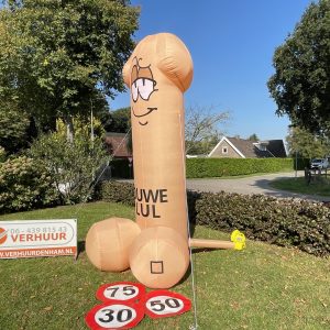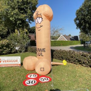 Ouwe Lul van 3,5 meter hoog! Deze opblaasbare Ouwe Lul is erg leuk bij elk feest en tevens inzetbaar voor vele andere leeftijden van een 16-jarige tot bv. 90-jarige , op elke feest locatie. De feestpop is verpakt in een makkelijk hanteerbare transporttas en is inclusief kleine blower. Deze blower is waterdicht en werkt op normale stroomvoorziening (dus geen krachtstroom nodig). De blower en het opblaasfiguur zijn in iedere auto gemakkelijk te vervoeren. Opzetten dient met 2 personen te gebeuren en is circa 2 minuten werk.