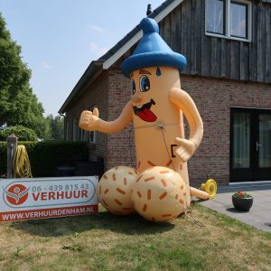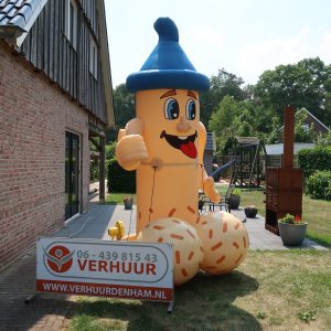 Ouwe Lul van 3,5 meter hoog! Deze opblaasbare Ouwe Lul is erg leuk bij elk feest en tevens inzetbaar voor vele andere leeftijden van een 16-jarige tot bv. 90-jarige , op elke feestlocatie. De feestpop is verpakt in een makkelijk hanteerbare transporttas en is inclusief kleine blower. Deze blower is waterdicht en werkt op normale stroomvoorziening (dus geen krachtstroom nodig). De blower en het opblaasfiguur zijn in iedere auto gemakkelijk te vervoeren. Opzetten dient met 2 personen te gebeuren en is circa 2 minuten werk.