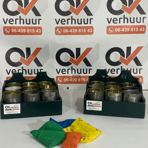 Bij OK Verhuur kunt u het nostalgische Oud-Hollandse spel pittenzak gooien huren! Dit geliefde spel, geschikt voor alle leeftijden, brengt gegarandeerd plezier en competitie naar uw feest of evenement. Gooi de pittenzakken in de gaten van het blikje en verzamel punten. Ideaal voor verjaardagen, familiebijeenkomsten, en bedrijfsuitjes. Huur vandaag nog en geniet van dit traditionele Nederlandse spel vol gezelligheid en uitdaging!