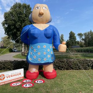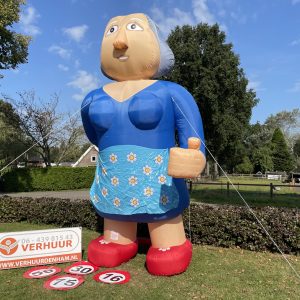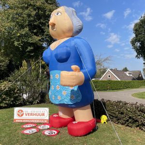 Deze opblaasbare Sarah van 4.5 meter hoog! Deze opblaasbare Sarah is erg leuk in de tuin bij de 50-jarige of bij de feest locatie. Het opblaasfiguur is verpakt in een makkelijk hanteerbare transporttas en is inclusief kleine blower. Deze blower is waterdicht en werkt op normale stroomvoorziening (dus geen krachtstroom nodig). De blower en het opblaasfiguur zijn in iedere auto gemakkelijk te vervoeren. Opzetten dient met 2 personen te gebeuren en is circa 2 minuten werk.