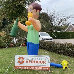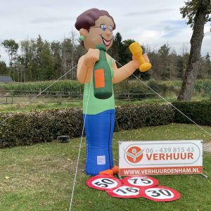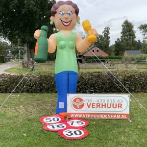 Onze nieuwe Sarah Wijnfles van 3,8 meter hoog! Deze opblaasbare Sarah Wijnfles is erg leuk in de tuin bij de 50-jarige of bij de feest locatie. De feestpop is verpakt in een makkelijk hanteerbare transporttas en is inclusief kleine blower. Deze blower is waterdicht en werkt op normale stroomvoorziening (dus geen krachtstroom nodig). De blower en het opblaasfiguur zijn in iedere auto gemakkelijk te vervoeren. Opzetten dient met 2 personen te gebeuren en is circa 2 minuten werk.