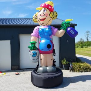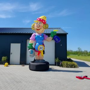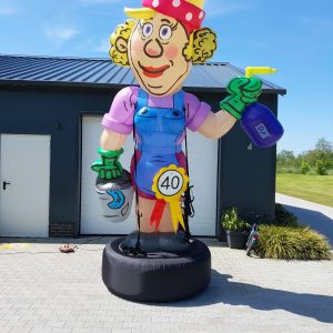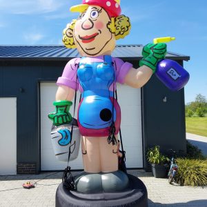 Met deze schoonmaakster van 4,0 meter hoog zie je meteen wat voor beroep of hobby de jarige heeft! Deze opblaasbare schoonmaakster is erg leuk in de tuin bij de 18 t/m 90-jarige of bij een feest locatie. De feestpop is verpakt in een makkelijk hanteerbare transporttas en is inclusief kleine blower. Deze blower is waterdicht en werkt op normale stroomvoorziening (dus geen krachtstroom nodig). De blower en het opblaasfiguur zijn in iedere auto gemakkelijk te vervoeren. Opzetten dient met 2 personen te gebeuren en is circa 2 minuten werk.