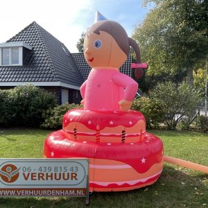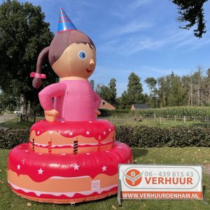 Opblaasbare Sarah Taart Junior met taart van 3,5 meter hoog! Deze opblaasbare Opblaasbare Sarah Taart junior met taart is erg leuk in de tuin bij de 16-jarige of bij de feest locatie. De feestpop is verpakt in een makkelijk hanteerbare transporttas en is inclusief kleine blower. Deze blower is waterdicht en werkt op normale stroomvoorziening (dus geen krachtstroom nodig). De blower en het opblaasfiguur zijn in iedere auto gemakkelijk te vervoeren. Opzetten dient met 2 personen te gebeuren en is circa 2 minuten werk.