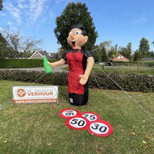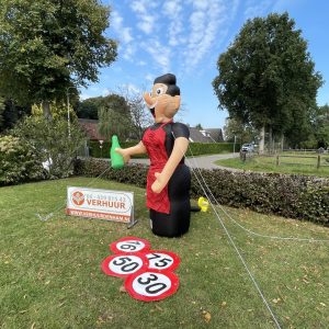 Onze nieuwe Sarah Wijnfles van 3,0 meter hoog! Deze opblaasbare Sarah Wijnfles is erg leuk in de tuin bij de 50-jarige of bij de feest locatie. De feestpop is verpakt in een makkelijk hanteerbare transporttas en is inclusief kleine blower. Deze blower is waterdicht en werkt op normale stroomvoorziening (dus geen krachtstroom nodig). De blower en het opblaasfiguur zijn in iedere auto gemakkelijk te vervoeren. Opzetten dient met 2 personen te gebeuren en is circa 2 minuten werk.