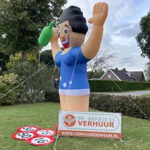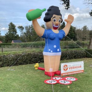 Onze nieuwe Sarah Wijnfles van 3,5 meter hoog! Deze opblaasbare Sarah Wijnfles is erg leuk in de tuin bij de 50-jarige of bij de feest locatie. De feestpop is verpakt in een makkelijk hanteerbare transporttas en is inclusief kleine blower. Deze blower is waterdicht en werkt op normale stroomvoorziening (dus geen krachtstroom nodig). De blower en het opblaasfiguur zijn in iedere auto gemakkelijk te vervoeren. Opzetten dient met 2 personen te gebeuren en is circa 2 minuten werk.