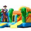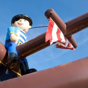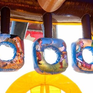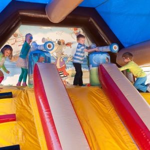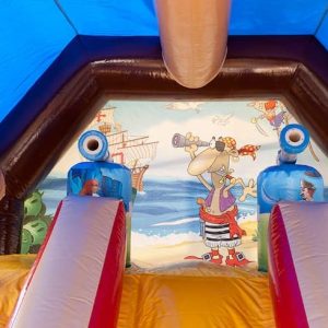Bezorg kinderen de dag van hun leven met de Shooting combo met piraat thema! Bovenaan de glijbaan zitten twee kanonnen waarmee (op luchtdruk van de inflatable) ballen geschoten kunnen worden. Er zijn diverse targets met gaten binnenin, waar de ballen doorheen geschoten kunnen worden. Deze shooting combo met piraat thema is door onze eigen designers ontworpen in een piratenthema en heeft de uitstraling van een echt piratenschip. Binnen is er ruimte om te springen, te spelen en te glijden. Het springkussen heeft de vorm van een groot piratenschip. Op de mast zit een grote 3D piraat. Spring zo snel mogelijk naar binnen, klim via de dubbele klimhelling omhoog en schiet met de shooters op de doeltjes. Daarna kun je via de glijbaan weer naar beneden.