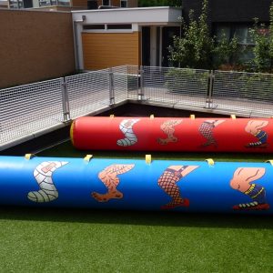 Blauwe Skippyslang Cartoon met ludieke opdruk. Met vier personen tegelijk springen en vooruit zien te komen, hilariteit alom! De Skippyslang is 3,5 meter lang en de diameter is 50 cm. Deze Skippyslang is inzetbaar bij tal van (sport)activiteiten, evenementen en feesten. meerder aanwezig om samen een competitie te starten!