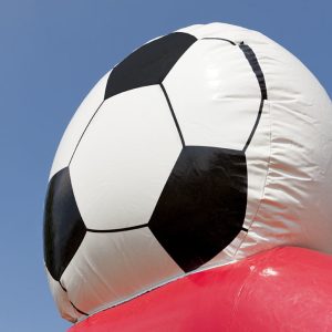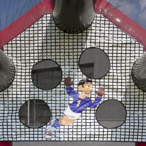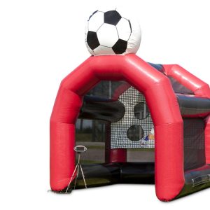 Dit is de attractie Snelheid schieten, ook wel “Dikke Bertha” genoemd. Een opblaasbaar voetbalspel waarbij snelheid centraal staat! De snelheidsmeter meet hoe hard een speler de bal in de targets weet te schieten. Deze targets zijn verwerkt in het doek dat tegen de achterwand hangt. Probeer de voetbal in één van de gaten te schieten. Dit spel is perfect om jouw schot te oefenen, maar kan ook met meerdere personen worden gespeeld. Schiet jij de snelste bal?