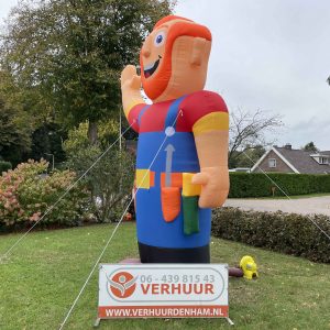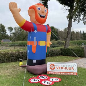 Deze Abraham Timmerman van 4 meter hoog! Deze opblaasbare Abraham Timmerman is erg leuk in de tuin bij de 50-jarige of bij de feest locatie. De feestpop is verpakt in een makkelijk hanteerbare transporttas en is inclusief kleine blower. Deze blower is waterdicht en werkt op normale stroomvoorziening (dus geen krachtstroom nodig). De blower en het opblaasfiguur zijn in iedere auto gemakkelijk te vervoeren. Opzetten dient met 2 personen te gebeuren en is circa 2 minuten werk.